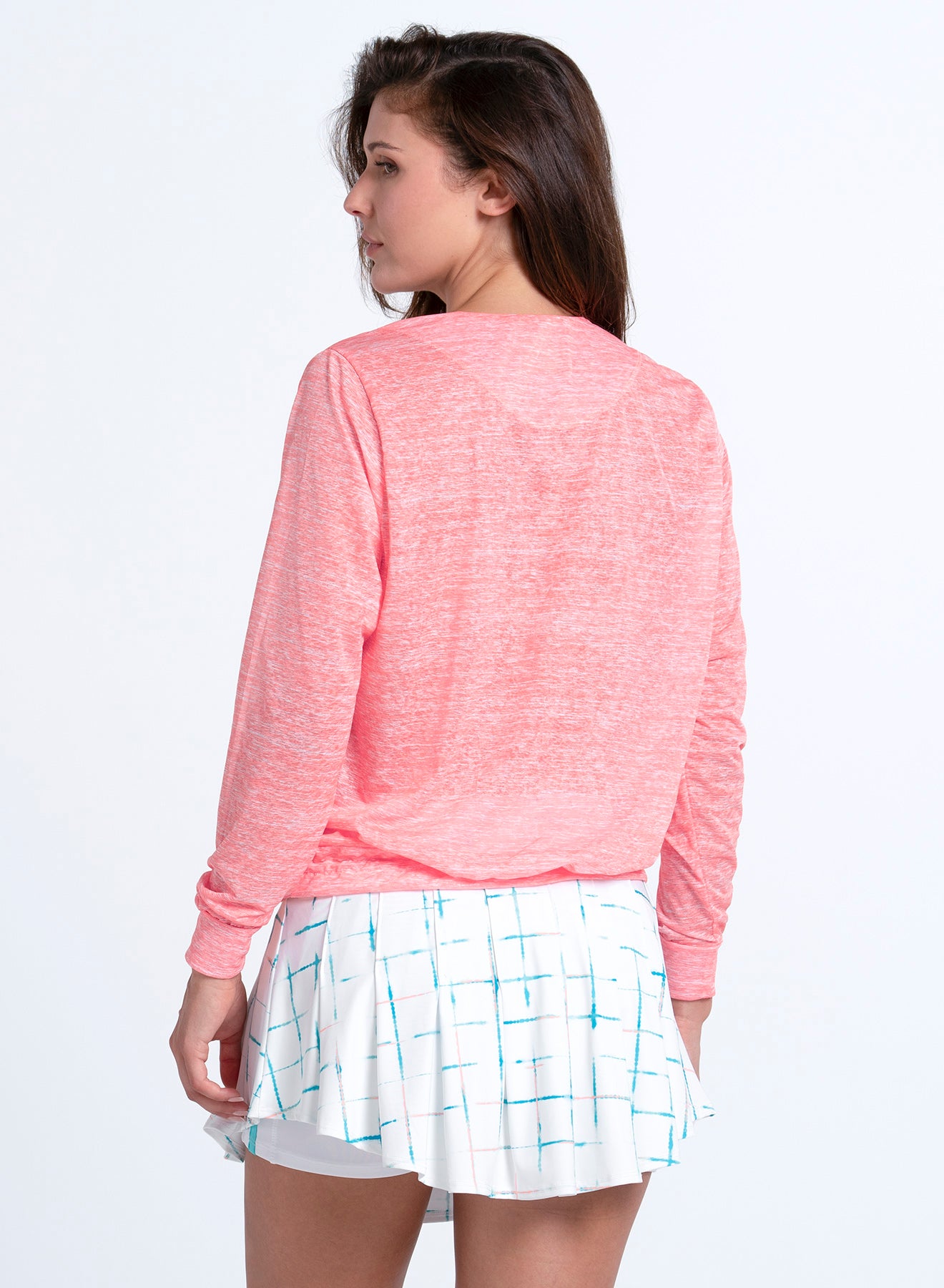 This pullover is as easy on the eyes as it is to throw on. Crafted from featherweight fabrics done in a space dye that’s all the craze this season. It also features a chic V-neck, an adjustable bungee detail for a customizable fit and is designed to hit at the high hip for the ultimate in style and comfort.