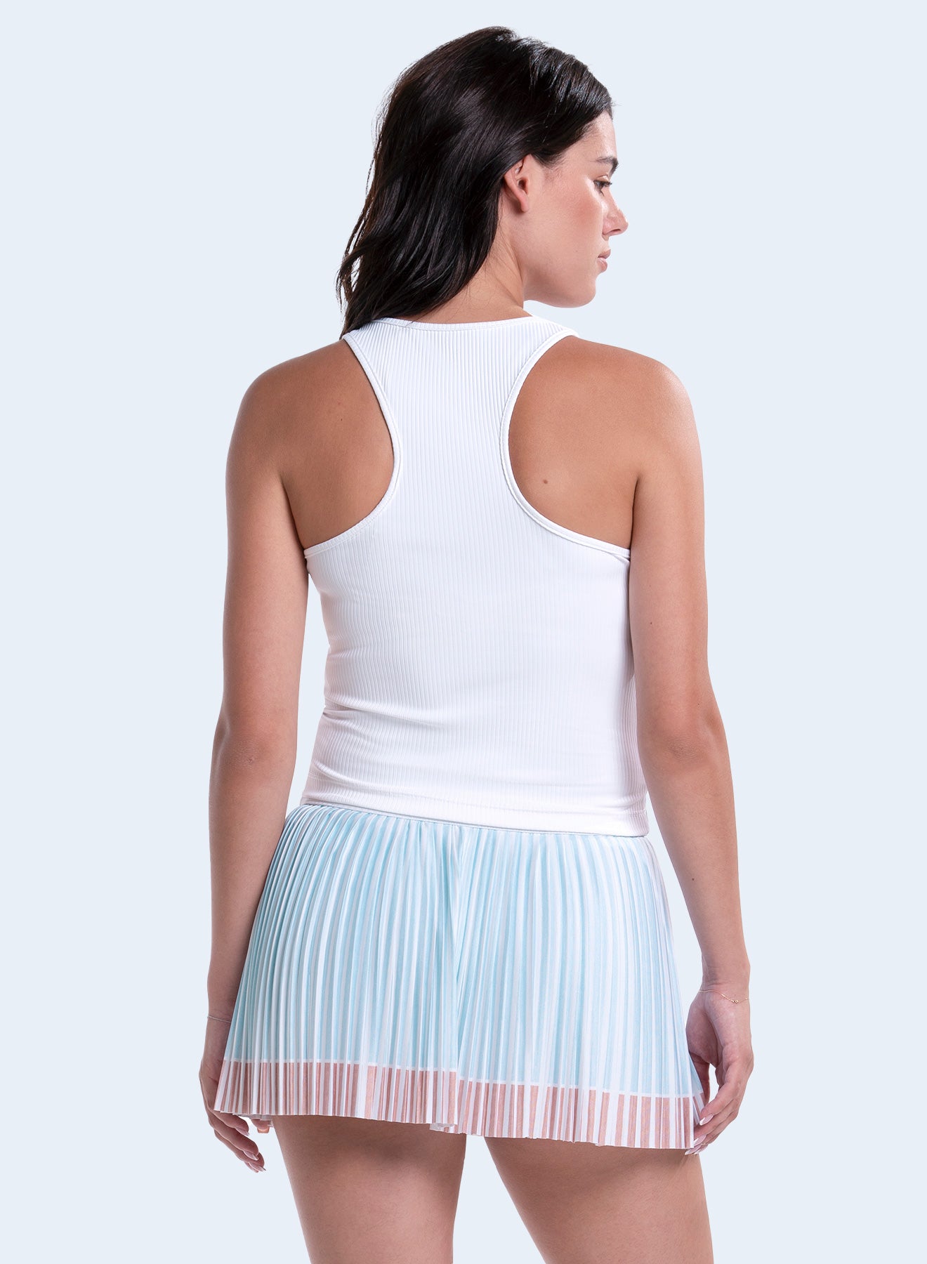 Command the court in our compression rib tank, designed to hit at the high hip for a sleek, sophisticated look. With flattering tuxedo stripes, this tank ensures you feel both powerful and polished.