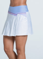 An updated progressive golf look for the course. This color blocked, asymmetrical, inverted pleat skort features a mesh pattern print paired with pops of baby lavender. It’s a classic A-line silhouette with a flattering fit that floats with the body.