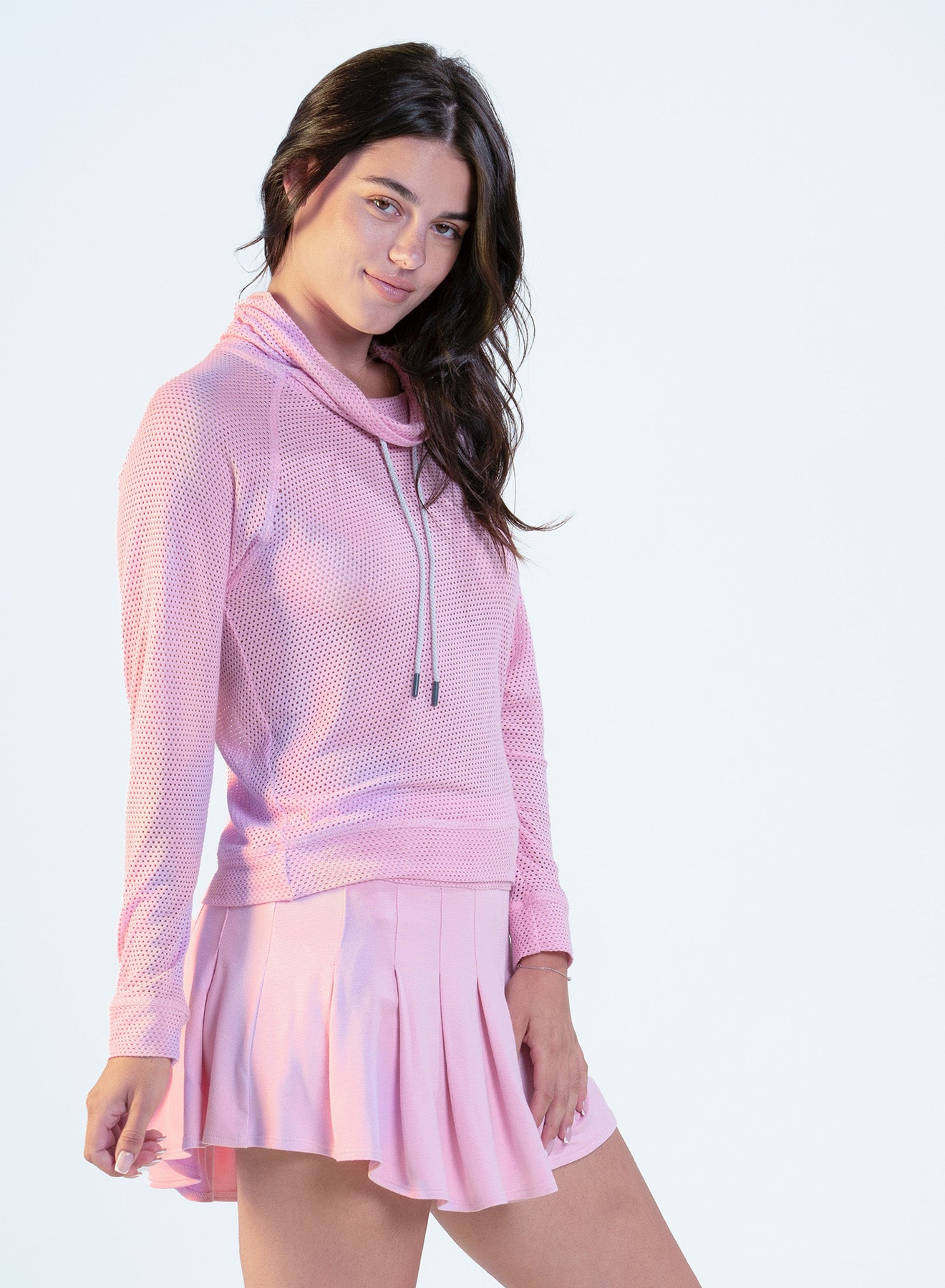 Transform your wardrobe with our avant-garde mesh throw over, your new favorite piece for both style and comfort. Featuring a chic cowl neck with a drawstring neckline, this ultra-lightweight mesh fabric creates a progressive look that ensures you can travel or relax in style.