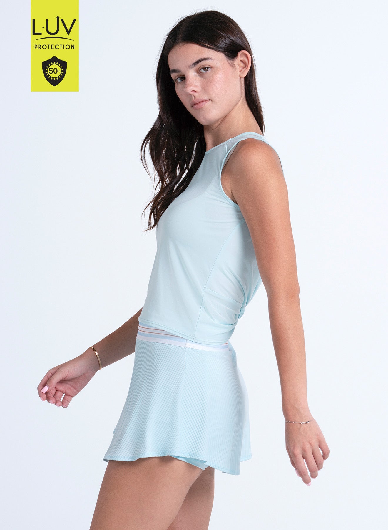 Fashion forward with a twist. This wave blue tank has a twist back hemline done in our Hip Fit that’s inspired by the crop top trend but keeps you covered hitting at the high hip. It also features a higher neckline, mesh shoulder panels for added fashion and breathability and is designed to float on the body.