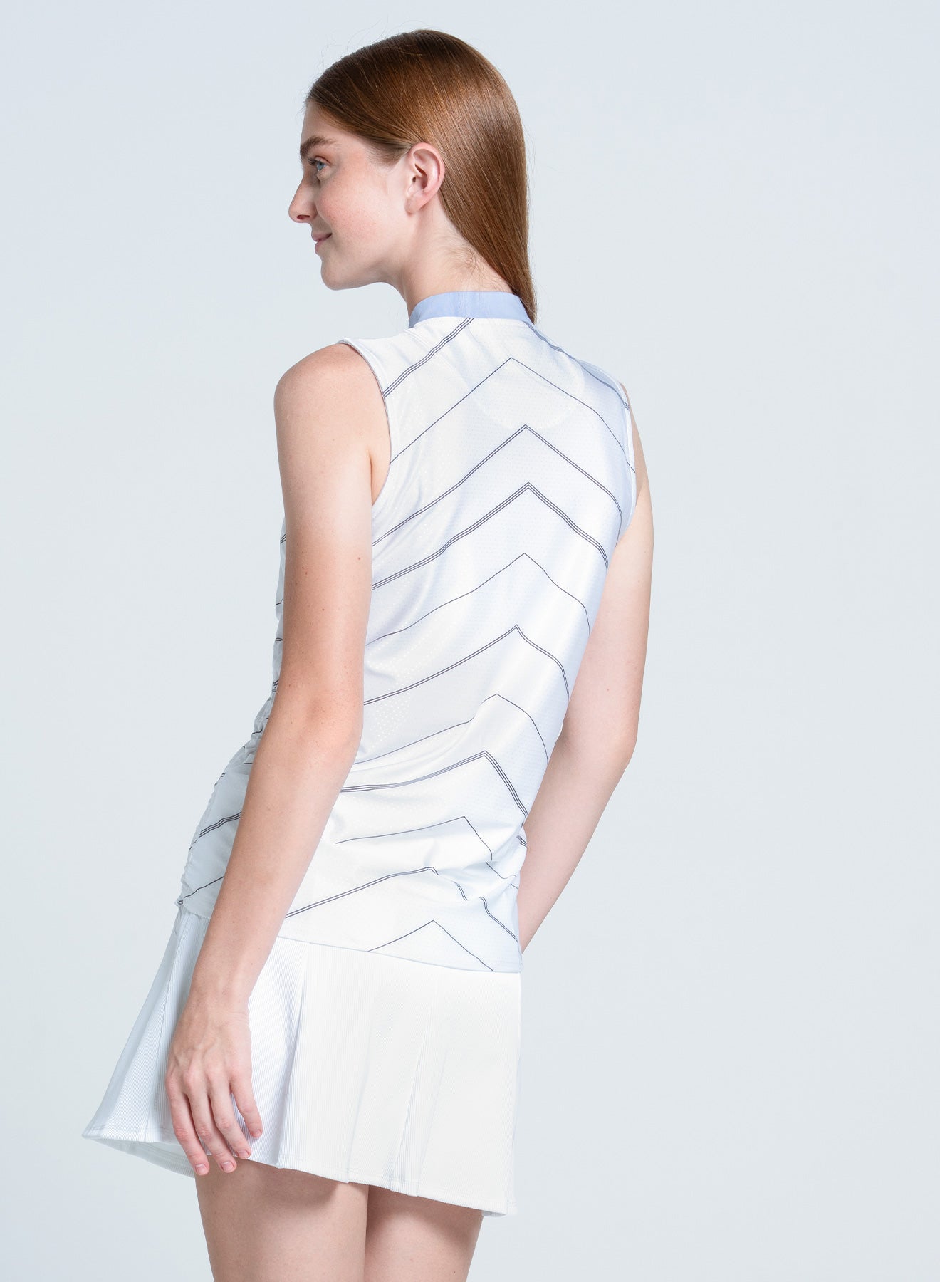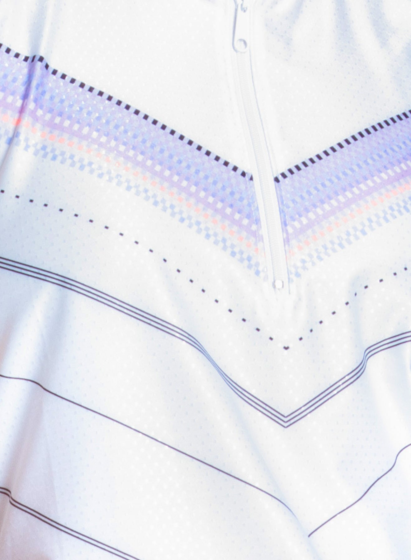 An update to your classic stripe top. Featuring a banded modern zip neck closure and bold ombre classic chevron stripes. The chevron stripes and side seam ruching create a flattering fit that floats on the body.