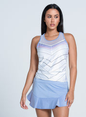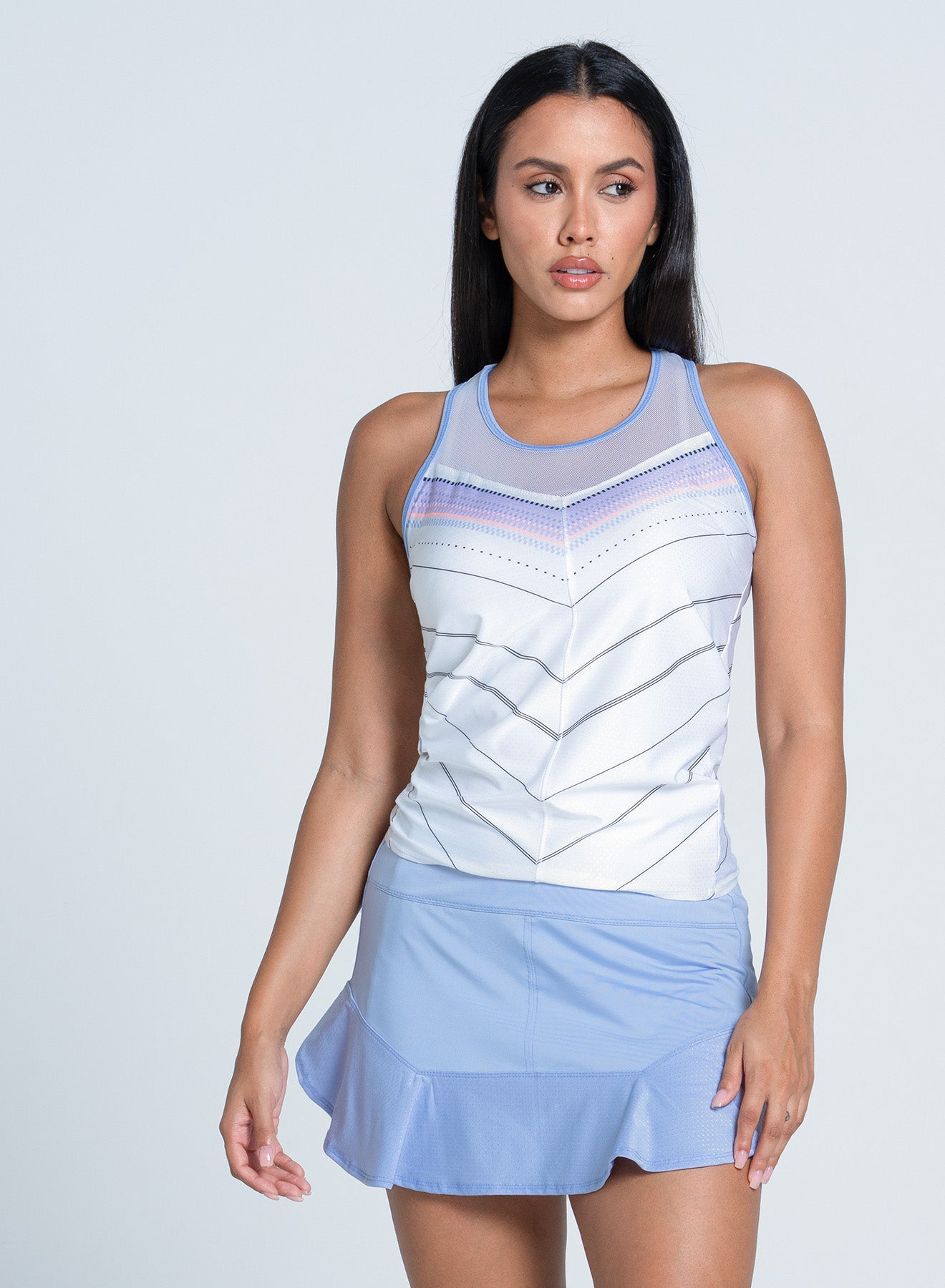 A modern A-line skirt ready to flatter your fit and your game. This fun skirt features tuxedo stripes down the side seams and a high-low hemline with a mixed media flounce border that will compliment your look.