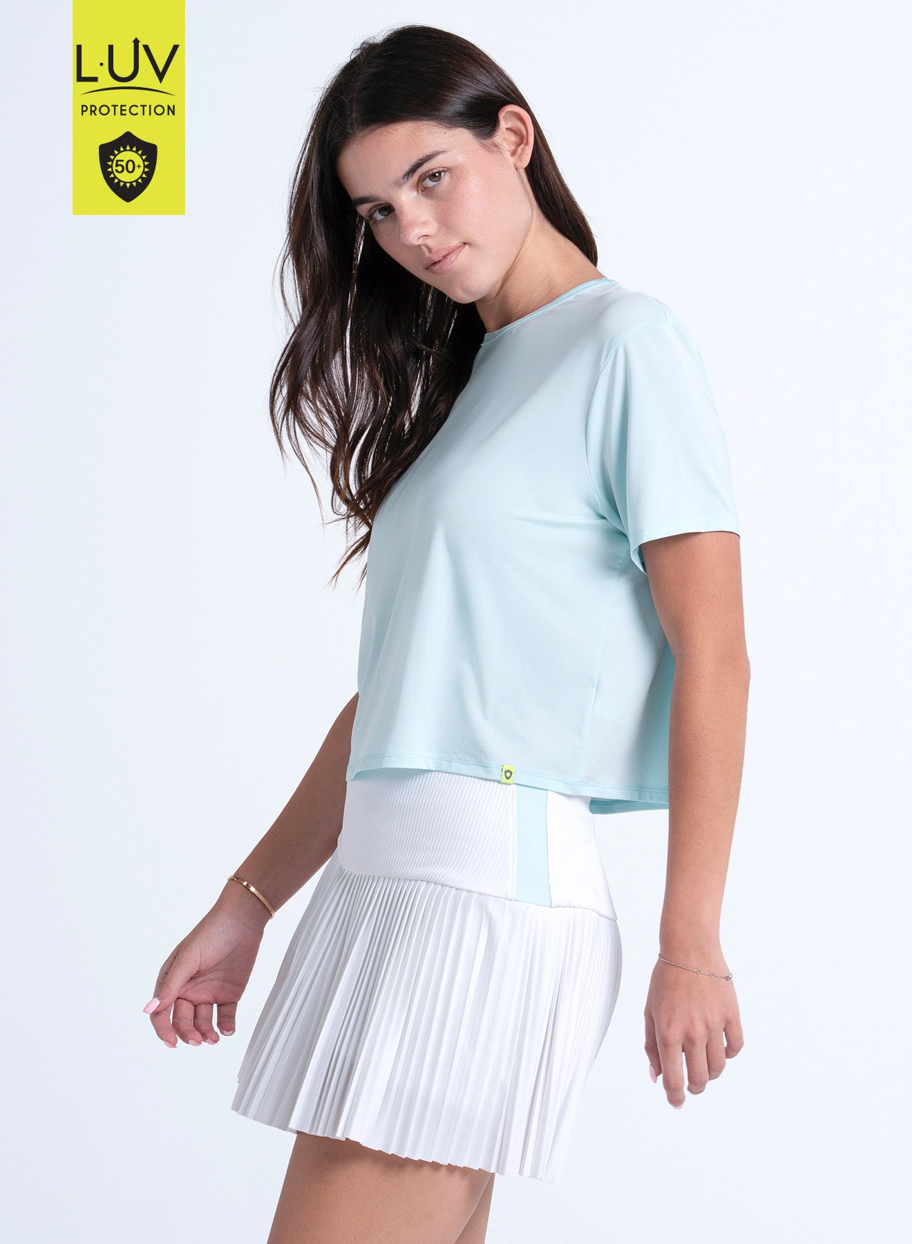 Meet the tee of the season. A boxy crew neck design that’s the perfect throw on piece to wear with any fashionable skirt, creating a sporty feminine look. It’s all done in our ultra lightweight SPF 50 LUV sun protection fabric.