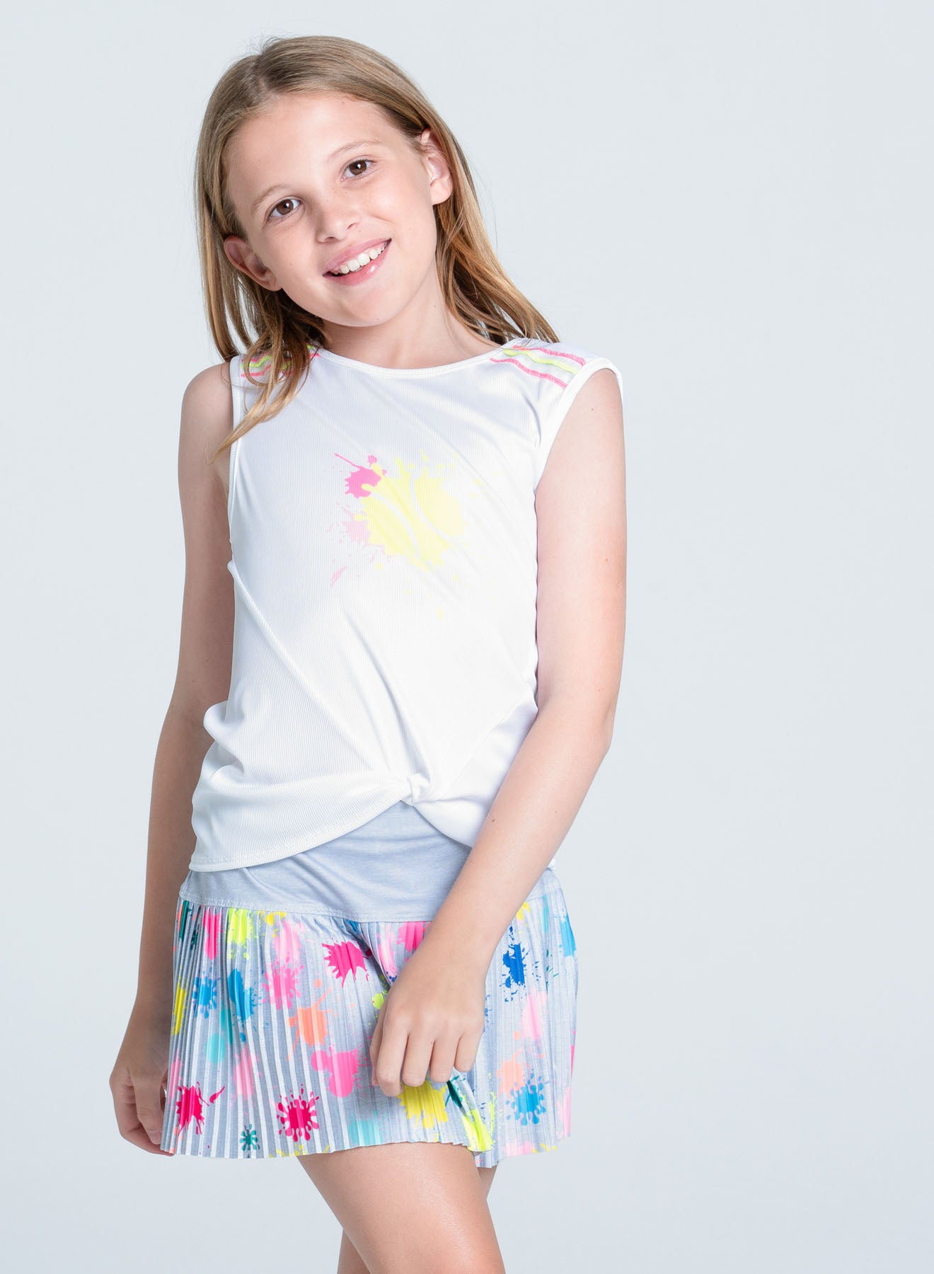 This one is sure to be a smash with her friends. A sporty heather gray skirt with pops of color from the paint splash print design. It’s all done on our performance fabric pleated skirt. Comes with a built-in performance shortie.